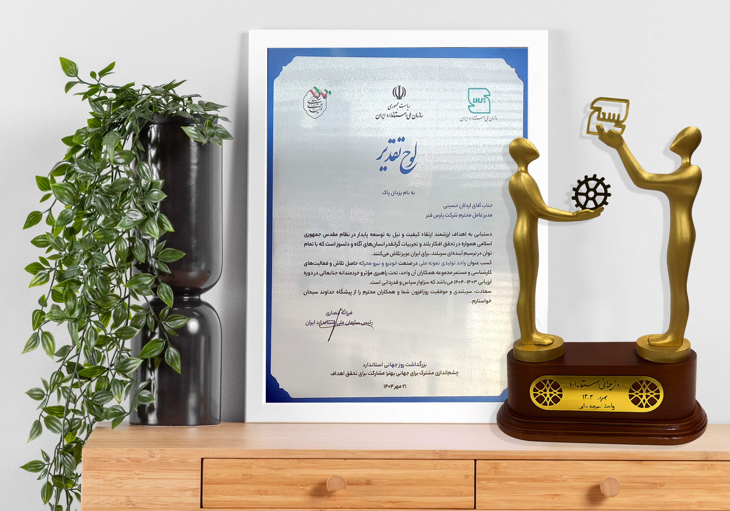 main01شرکت پارس فنر به عنوان "واحد نمونه کشوری" در سال 1404 main02دارای گواهینامه استاندارد DQS آلمانmain03تولید کننده انواع فنر خودروmain01تولید کننده انواع فنر تخت خودرو فرم صدای شما فرم درخواست نمایندگی فرم تامین کنندگان فرم امکان سنجی تولید شرکت پارس فنر پیشرو در صنعت فنر سازی ایران و خاورمیانه سابقه فعالیت0سال تعداد پرسنل0نفر حجم تولید سالانه0تن تنوع محصولات0نوع جستجوی محصولات تفکیک محصولات بر اساس محل مصرف خودروهای سبک خودروهای نیمه سنگین خودروهای سنگین تریلر صنایع ریلی گالری تصاویر اخبار و تازهها اطلاعیههای مهم مناقصه و مزایده اخبار و تازهها شرکت پارس فنر، واحد تولیدی نمونه ملی استاندارد ایران شد ۲۳ مهر ۱۴۰۴ انتخاب شرکت پارسفنر به عنوان واحد نمونه کشوری در سال ۱۴۰۴ مهر ۱۳, ۱۴۰۴ حضور شرکت پارس فنر در ششمین نمایشگاه بین المللی حمل و نقل ، لجستیک و صنایع وابسته شهریور ۹, ۱۴۰۴ برگزاری مجمع عمومی عادی سالیانه شرکت پارس فنر مورخ 1404/04/26 تیر ۲۶, ۱۴۰۴ اطلاعیههای مهم جدول زمانبندی پرداخت سود سهام دوره مالی 1403.12.30 ۱۶ تیر ۱۴۰۴ اصلاحیه زمانبندی پرداخت سود سهام دوره مالی 1402.12.29 تیر ۱۷, ۱۴۰۳ جدول زمانبندی پرداخت سود سهام دوره مالی 1402.12.29 خرداد ۳۱, ۱۴۰۳ مناقصه و مزایده متاسفانه مطلبی یافت نشد متاسفانه مطلبی یافت نشد مشتریان ما زامیاد ساپکو سایپا دیزل ارس خودرو دیزل (آمیکو) سایپا یدک سهند ریل کرمان موتور ایران کاوه سایپا ایران خودرو بهمن موتور Next Previous گواهینامه ها و استانداردها En ISO 9001-2015 DQS گواهی سیستم مدیریت کیفیت توسط گواهی پذیرش بازار سهام IATF 16949-2016 گواهی سیستم مدیریت کیفیت گواهینامه عضویت انجمن سازندگان قطعات و مجموعه های خودرو گواهی نامه تایید صلاحیت آزمایشگاه 1403 - NACI En ISO 9001:2008 گواهی سیستم مدیریت کیفیت توسط توف نورد تاریخ اعتبار : 2018 میلادی ISO /TS 16949:2009 گواهی سیستم مدیریت کیفیت محصولات و خدمات مرتبط با خودرو توسط توف نورد تاریخ اعتبار : 2018 میلادی ISO /TS 16949:2009 گواهی سیستم مدیریت کیفیت محصولات و خدمات مرتبط با خودرو توسط توف نورد پروانه کاربرد علامت استاندارد سال 1401 گواهی تایید صلاحیت آزمایشگاه همکار صفحه 2 گواهی تایید صلاحیت آزمایشگاه همکار صفحه 1 تقدیر و تشکر مجلس شورای اسلامی از شرکت پارس فنر در جهت نیل به اهداف استراتژیک انتخاب شرکت پارس فنر به عنوان واحد نمونه استاندارد سال 1393 گواهی تحقیق و توسعه En ISO 9001:2008 گواهی سیستم مدیریت کیفیت توسط توف نورد گواهينامه مديريت كيفيت ISO 9001 ورژن 2000 از مرجع صلاحيت RVA هلند گواهينامه مديريت كيفيت ISO 9001 ورژن 2000 از مرجع صلاحيت GLC و DAR آلمان گواهينامه مديريت كيفيت ISO 9001 ورژن 2000 از مرجع صلاحيت GLC آلمان و RVA هلند گواهينامه مديريت كيفيت ISO 9001 ورژن 2000 از مرجع صلاحيت DAR آلمان En ISO 9001-2008 گواهی سیستم مدیریت کیفیت توسط توف نورد تندیس صادر کننده نمونه استان مرکزی-پارس فنر 1400 تندیس صادر کننده نمونه استان مرکزی-پارس فنر 1399 تندیس صادر کننده نمونه استان مرکزی-پارس فنر 1398 تمدید گواهینامه علامت استاندارد ملی ایران تمدید گواهینامه استاندارد مدیریت کیفیت DQS واحد نمونه کشور در سال 1403-1404